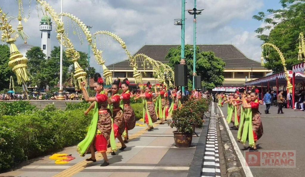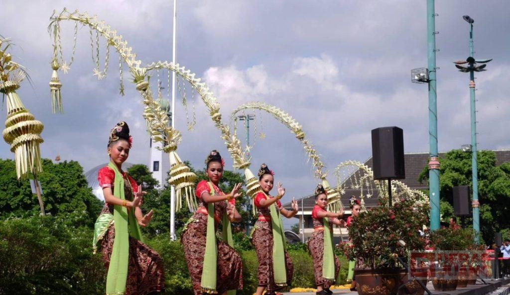 Kabupaten Banyumas – Puluhan penari muda membawakan “Tari Rumeksa” untuk memeriahkan upacara Hari Jadi Kabupaten Banyumas ke-453, di Alun-alun Purwokerto, Kamis (22/2/2024). Mereka berasal dari Sanggar Seni Graha Mustika Purwokerto dan Sanggar Seni Dharmo Yuwono Purwokerto.