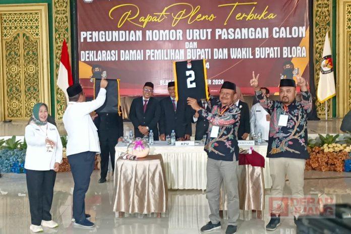 Kabupaten Blora – Berdasarkan rapat pleno terbuka pengundian nomor urut pasangan calon bupati dan calon wakil bupati Kabupaten Blora yang di adakan oleh Komisi Pemilihan Umum di Gedung Larasati, Pasangan Abu Nafi dan Andika Adikrishna mendapatkan nomor urut 2, Senin (23/09/2024).