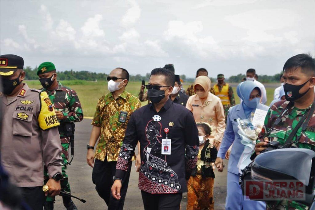 Kabupaten Purbalingga – Ketua DPRD Kab. Purbalingga, HR Bambang Irawan bersama Bupati Kab. Purbalingga, Dyah Hayuning Pratiwi menghadiri proving flight atau uji coba penerbangan pesawat Citilink seri ATR72-600 yang take-off dari Bandara Halim Perdana Kusuma Jakarta yang mendarat di Bandara Jenderal Besar Soedirman, Kamis (1/4/2021).