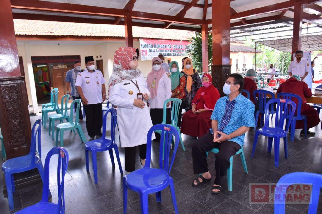 Kabupaten Sukoharjo – Bupati Sukoharjo, Hj. Etik Suryani, S.E., M.M., melakukan monitoring pemberian vaksin Covid-19, untuk lanjut usia (lansia) di Desa Langenharjo, Grogol, Rabu (19/5/2021). Dalam kesempatan tersebut, Hj. Etik Suryani menghimbau, setelah melakukan vaksinasi, harus tetap menerapkan Protokol Kesehatan. Sebab, vaksin bukan merupakan obat Covid-19.