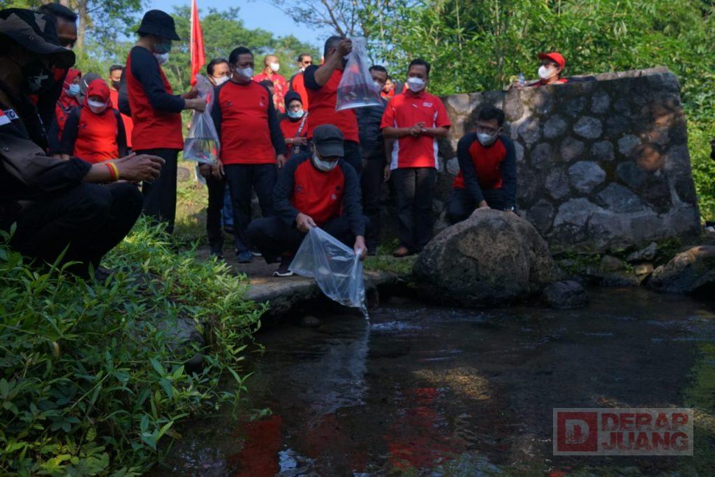 Kabupaten Boyolali – Dalam rangka memperingati Bulan Bung Karno Tahun 2021, DPC PDI Perjuangan Boyolali menaburkan sekitar 1000 benih ikan jenis Wader, serta melakukan penanaman 100 batang pohon dengan jenis tanaman Kemiri, Baobab, Kaki Gajah, serta Cendana. Kegiatan tersebut dilaksanakan di sekitar Siti Inggil, tepatnya di Desa Bendan, Kecamatan Banyudono, Minggu (20/6/2021).