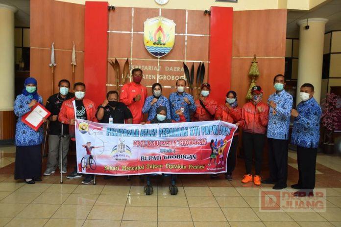 Acara yang dilaksanakan di Kantor Bupati itu juga dihadiri oleh Wakil Bupati Bambang Pujiyanto, Kadisporabudpar Grobogan Ngadino, Kabid Olahraga Nur Yasin, Ketua National Paralympic Committee Indonesia (NPCI) Grobogan Sunar, dan beberapa pengurus lainnya.