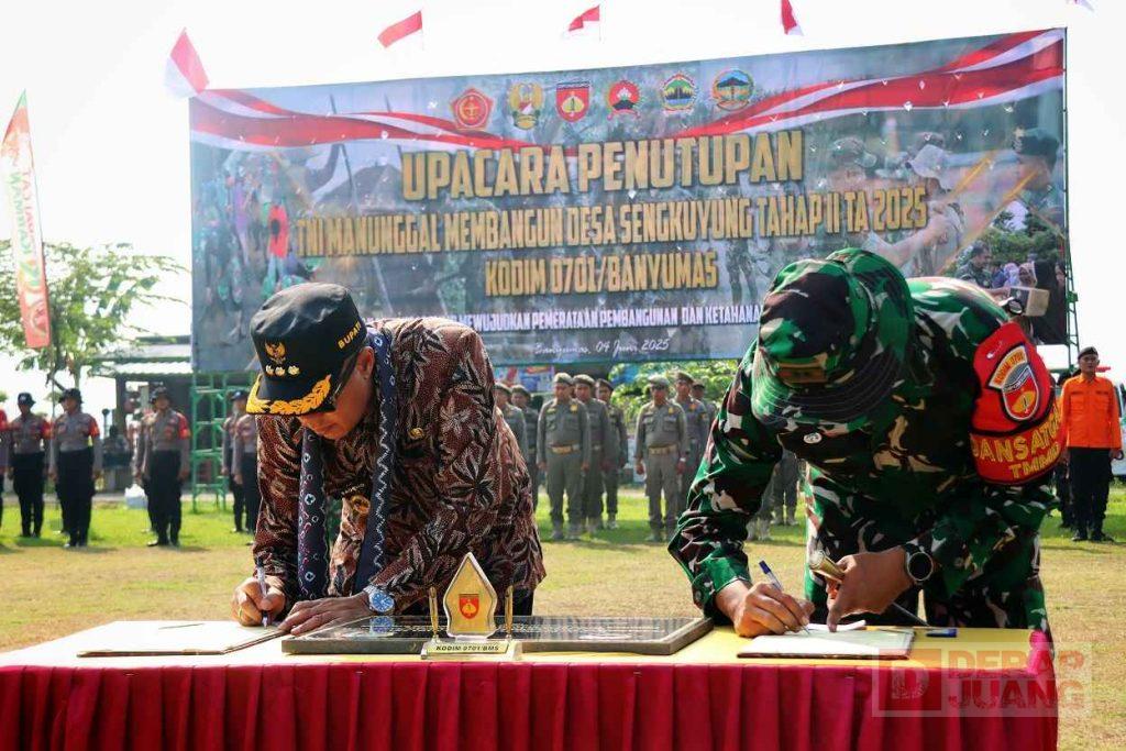 Kabupaten Banyumas – Bupati Banyumas, Drs. Sadewo Tri Lastiono, M.M., bersama Komandan Kodim 0701/Banyumas, Letkol. Arm. Ida Bagus Adi Purnama secara resmi menutup kegiatan Tentara Manunggal Membangun Desa (TMMD) Sengkuyung Tahap II , di lapangan Desa Pasinggangan, Banyumas pada Rabu (04/06/2025).