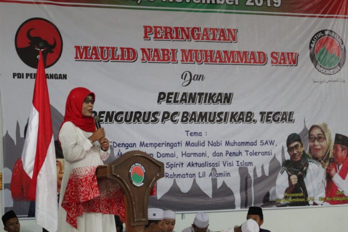 KAB. TEGAL – Pelantikan Pengurus Cabang Baitul Muslimin Indonesia (PC BAMUSI) Kabupaten Tegal sekaligus peringatan Maulid Nabi Muhammad Saw mengangkat “Spirit Aktualisasi Visi Islam Rahmatan Lil Alamin”. Bamusi merupakan organisasi sayap Partai Demokrasi Indonesia Perjuangan (PDIP) yang bergerak di bidang keislaman. Dewan Pimpinan Pusat Bamusi melantik Pengurus Cabang Bamusi Kabupaten Tegal, Minggu (3/11).