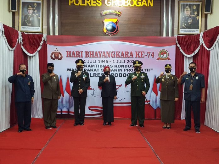 Kabupaten Grobogan – Ketua DPC PDI Perjuangan Kabupaten Grobogan Hj. Sri Sumarni, S.H., M.M. menghadiri upacara peringatan Hari Bayangkara ke-74. Upacara peringatan Hari Bhayangkara tersebut dilaksanakan di halaman Mapolres Grobogan, Rabu (1/7/2020).