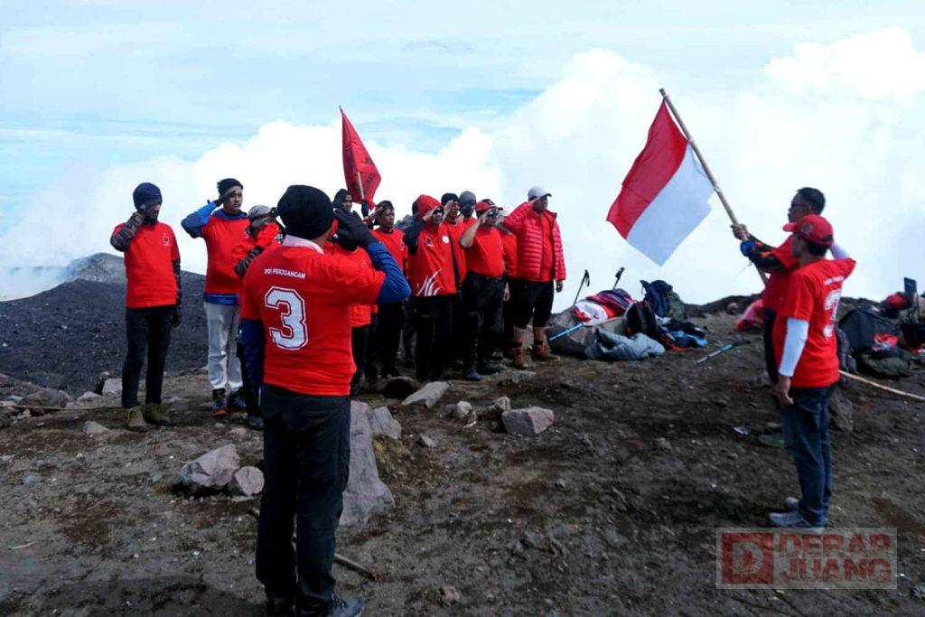 Rombongan pendaki tersebut melaksanakan upacara bendera dengan khidmat dalam rangka memperingati hari lahir Pancasila yang diperingati tiap tanggal 1 Juni. Bertindak sebagai inspektur upacara, Wakil Ketua Bidang Keagamaan DPC PDI Perjuangan Kab. Banyumas, Budi Wibowo dan pemimpin upacara yakni Anggota DPRD Kab. Banyumas Fraksi PDI Perjuangan, Anang Agus Kostrad Diharto.
