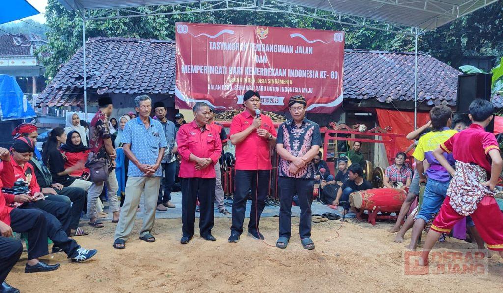 Foto: Wahju Djatmika (tengah memegang mic) bersama Saiful Hadi (kanan ) saat menghadiri tasyakuran pembangunan jalan sekaligus peringatan HUT Kemerdekaan RI ke-80 di Dusun Ndirun, Desa Singamerta.