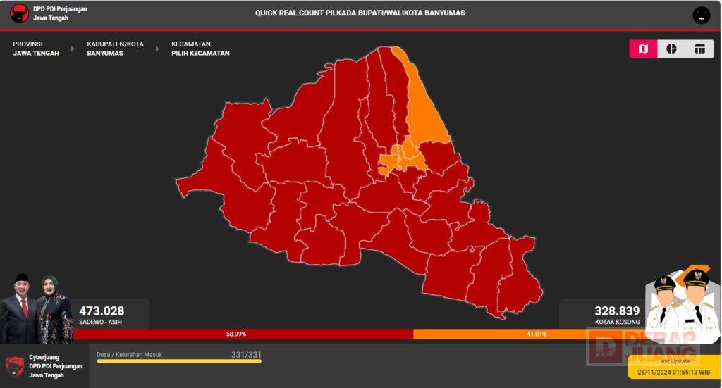 Kabupaten Banyumas – Calon tunggal Bupati dan Wakil Bupati Banyumas, Drs. Sadewo Tri Lastiono, M.M., – Dwi Asih Lintarti, unggul dalam perolehan suara sementara Pilkada Banyumas 2024.