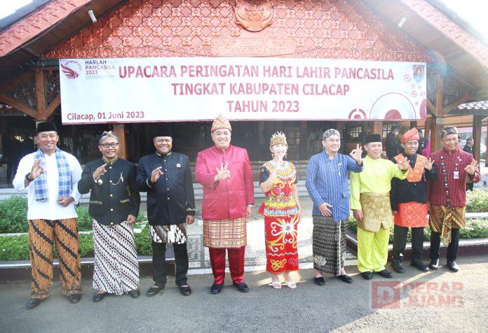 Kabupaten Cilacap – Dengan mengenakan pakaian adat, Ketua DPRD, sekaligus Ketua DPC PDI Perjuangan Kab. Cilacap, Taufik Nurhidayat mengikuti Upacara Peringatan Hari Lahir Pancasila ke-78 tahun Tingkat Kabupaten Cilacap Tahun 2023, di halaman Pendopo Pemerintah Kab. Cilacap, Kamis (1/6/2023).