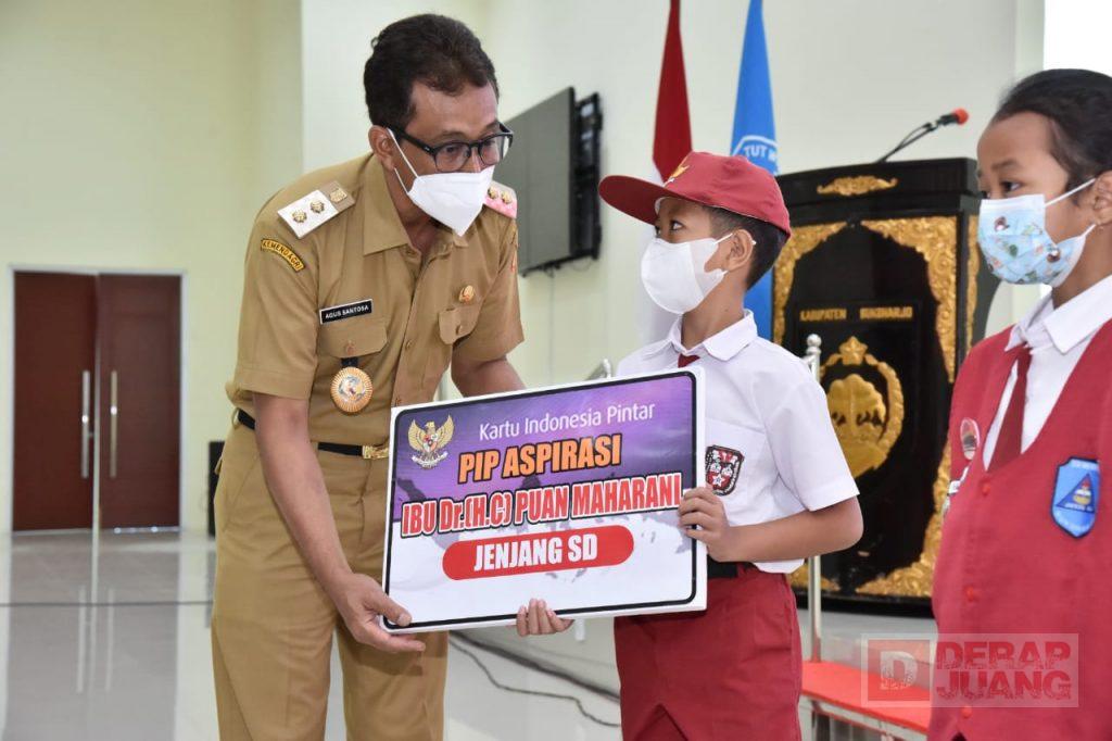 Kabupaten Sukoharjo – Sebanyak 1.563 siswa jenjang SD, SMP, SMA/SMK dan SLB menerima bantuan Program Indonesia Pintar (PIP) dari Ketua DPR RI, Puan Maharani, yang akrab disapa Mbak Puan. Secara simbolis bantuan PIP tersebut diberikan oleh Wakil Bupati Sukoharjo, Agus Santosa, di Auditorium Gedung Menara Wijaya, Senin (1/11/2021).