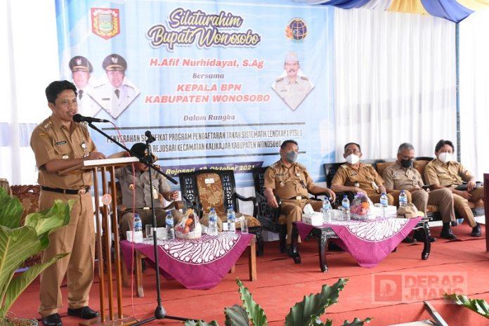 Kabupaten Wonosobo – Berbagai program kegiatan pembangunan baik yang bersumber dari Dana Transfer Desa, APBD Kabupaten, APBD Provinsi maupun APBN, merupakan bentuk resource negara yang digunakan untuk memfasilitasi dan memberikan pelayanan bagi masyarakat. Demikian disampaikan Bupati Wonosobo, Afif Nurhidayat pada kegiatan penyerahan Sertifikat Hak Atas Tanah program Pendaftaran Tanah Sistematis Lengkap (PTSL) di Balai Desa Rejosari, Kecamatan Kalikajar. Senin, (18/10/21).