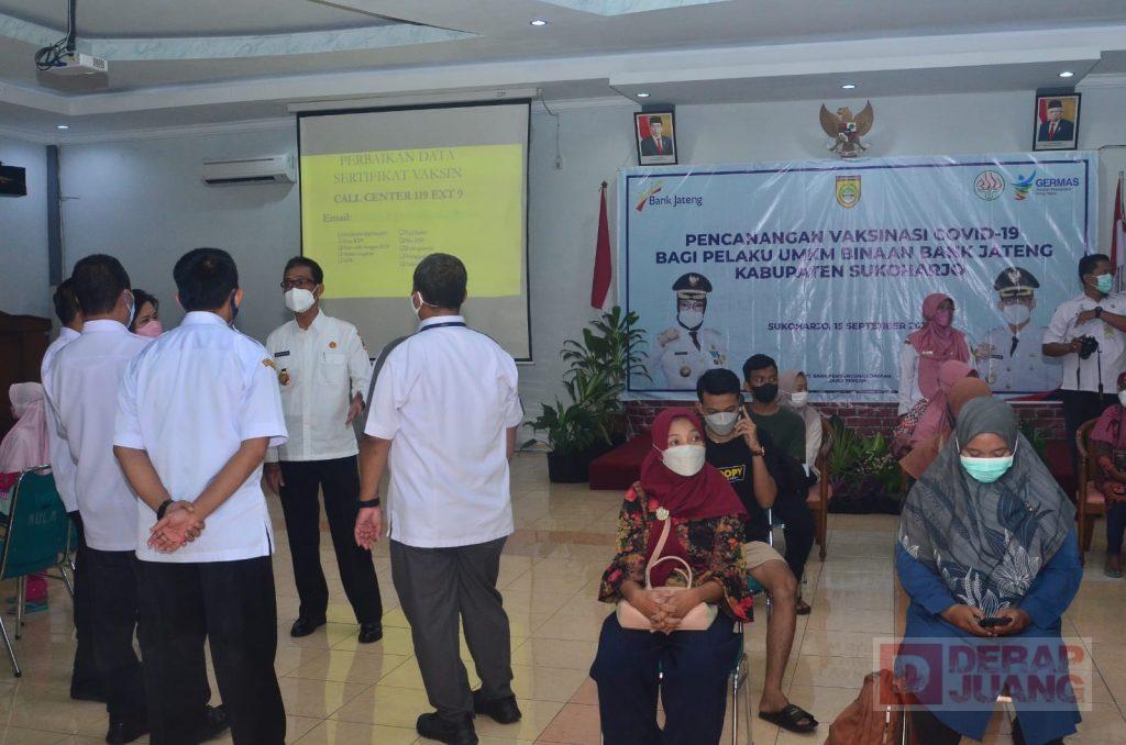 Kabupaten Sukoharjo – Wakil Bupati Sukoharjo, Drs. H. Agus Santosa melakukan pencanangan vaksinasi untuk pelaku UMKM di RSUD Ir. Soekarno. Program tersebut bekerjasama dengan Bank Jateng, dimana pelaku UMKM binaan Bank Jateng menjadi sasaran vaksinasi, Rabu (15/9/2021).