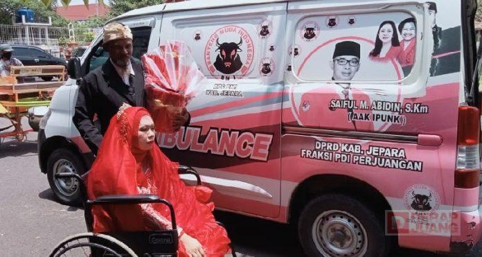 Ambulance Banteng Muda Indonesia (BMI) Kab. Jepara nampak mengantarkan Much Mangon dan Roinah, warga RT 05/RW 02 Desa Pecangaan Kulon untuk mengikuti kegiatan nikah massal yang bertempat di Pendopo Kab. Jepara.