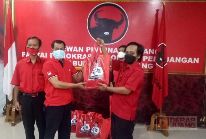 Bingkisan sembako yang berupa beras, gula, teh, dan minyak diserahkan secara simbolis oleh Staf Dede Indra Permana Sudiro, yaitu Benny Trias Santiko dan diterima langsung oleh Ketua DPC PDI Perjuangan Kabupaten Pemalang, H. Junaedi di Kantor DPC Partai.