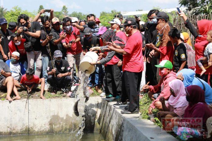 Kabupaten Klaten – Ketua DPC PDI Perjuangan Kab. Klaten, Hj. Sri Mulyani menebarkan 4 kwintal ikan ke sungai yang berada di Desa Jomboran , Kecamatan Klaten Tengah, Jum’at (13/11/2020).