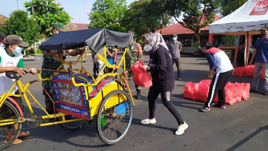 Purbalingga (5/4/2020), dalam rangka pencegahan penyebaran Covid-19 di Kabupaten Purbalingga, Bupati Purbalingga, Dyah Hayuning Pratiwi, S.E., B.Econ., M.M. memberikan bantuan Paket Sembako kepada 1.900 tukang becak, ojek online motor, dan ojek pangkalan di wilayah Kabupaten Purbalingga. Bantuan paket sembako tersebut berupa beras, minyak goreng, kecap, mie instan, dan kerupuk.