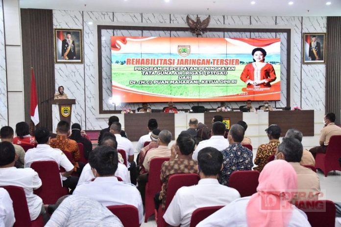Bupati juga menyampaikan, P3TGAI dilaksanakan untuk mendukung kedaulatan pangan nasional sebagai perwujudan kemandirian ekonomi dengan menggerakan sektor strategis ekonomi domestik sebagaimana termuat dalam program Nawacita ketujuh, yakni melalui pemberdayaan masyarakat petani dalam perbaikan jaringan irigasi, rehabilitasi jaringan irigasi, dan peningkatan jaringan irigasi secara partisipatif di wilayah pedesaan