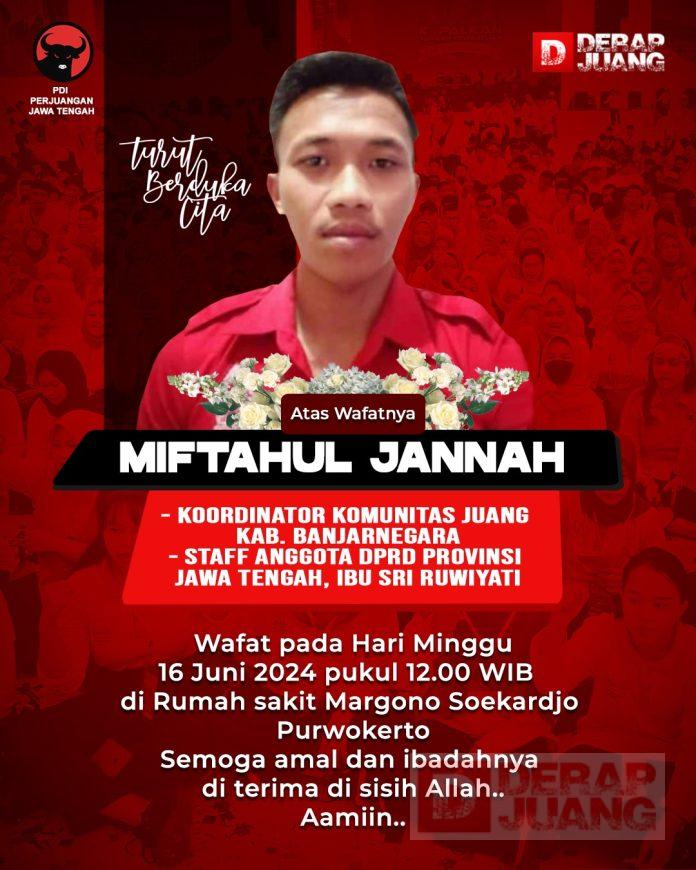 Diketahui, (Alm) Miftah meninggal dikarenakan sakit. Adapun semasa hidupnya ia memiliki semangat kontribusi dalam Korps. Dimana ia merupakan salah satu kader yang menjadi Koordinator untuk KJ Banjarnegara. Serta menjadi staff anggota DPRD Provinsi Jawa Tengah, Sri Ruwiyati.