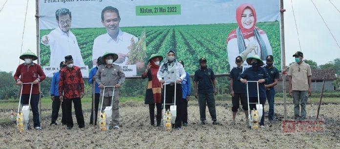 Kabupaten Klaten –Bupati Klaten, Hj. Sri Mulyani, S.M bersama Direktur Akabi Dirjen Tanaman Pangan Kementan membuka kegiatan Gerakan Tanam Kedelai dalam rangka peningkatan produksi kedelai melalui penerapan teknologi smart agricultural enterprise Universitas Gajah Mada di Desa Burikan, Cawas, Sabtu (21/5/2022).