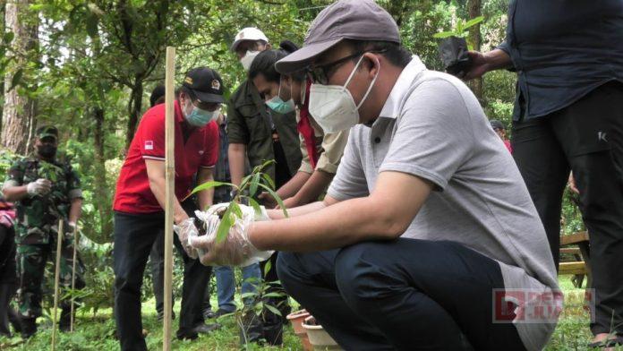 Kabupaten Banyumas – Bupati Banyumas, Achmad Husein bersama Wakil Bupati Banyumas, Sadewo Tri Lastiono, Ketua DPRD Banyumas, dr. Budhi Setiawan, Kepala Perwakilan Bank Indonesia (BI) Purwokerto Rony, Hartawan, serta pejabat lainnya, melakukan penanaman kantong semar (Nephentes Adrianii), yang merupakan tanaman Endemik Gunung Slamet. Kegiatan dilaksanakan di lereng Gunung Slamet selatan, kawasan Baturraden Adventure Forest (BAF), Rabu (23/2/2022).