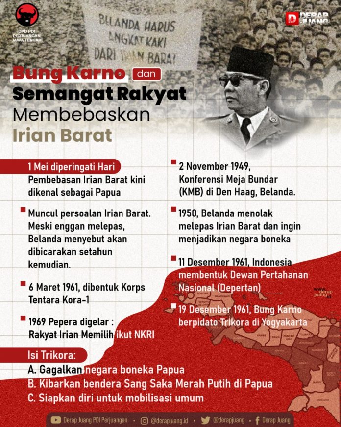 Kota Semarang – 1 Mei diperingati Hari Pembebasan Irian Barat yang kini dikenal sebagai Papua. Irian Barat memiliki sejarah panjang sebelum kembali bergabung dengan Indonesia. Operasi Tri Komando Rakyat (Trikora) merupakan upaya bangsa ini membebaskan Irian Barat dari cengkraman Belanda. Sejarah mencatat, Bung Karno mengumumkan seruan operasi ini dalam pidatonya tanggal 19 Desember 1961 di Yogyakarta.