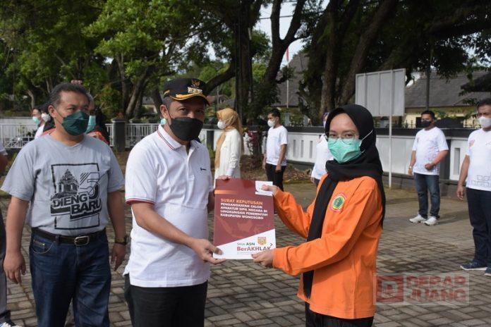 Kabupaten Wonosobo – Bupati Wonosobo, Afif Nurhidayat bersama Wakil Bupati, Muhammad Albar menyerahkan secara simbolis Surat Keputusan Pengangkatan Pegawai Pemerintah Dengan Perjanjian Kerja (P3K) Non Guru di Lingkungan Pemerintah Kabupaten Wonosobo formasi tahun 2021 di halamann Kantor BKD. Pada penyerahan tersebut Bupati didampingi Sekretaris Daerah One Andang Wardoyo dan Kepala BKD Tri Antoro serta dihadiri Asisten Sekda dan beberapa pimpinan OPD lainya, Jumat (25/2/2022).