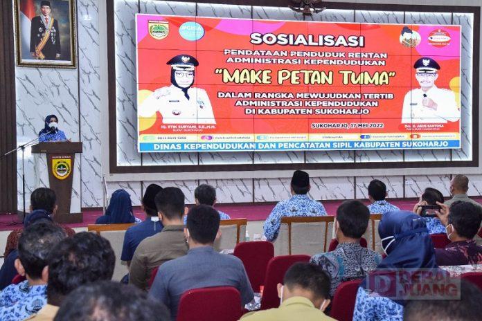 Kabupaten Sukoharjo – Bupati Sukoharjo, Etik Suryani meluncurkan program dari Disdukcapil, ‘Make Petan Tuma’ di lantai 10 Gedung Menara Wijaya, Selasa (17/5/2022).