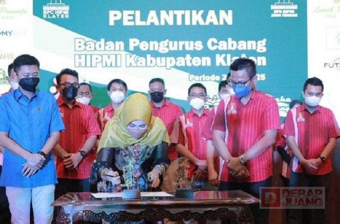 Kabupaten Klaten – Bupati Klaten, Hj. Sri Mulyani, S.M., menghadiri secara langsung pelantikan Badan Pengurus Cabang Himpunan Pengusaha Muda Indonesia (HIPMI) Kabupaten Klaten.