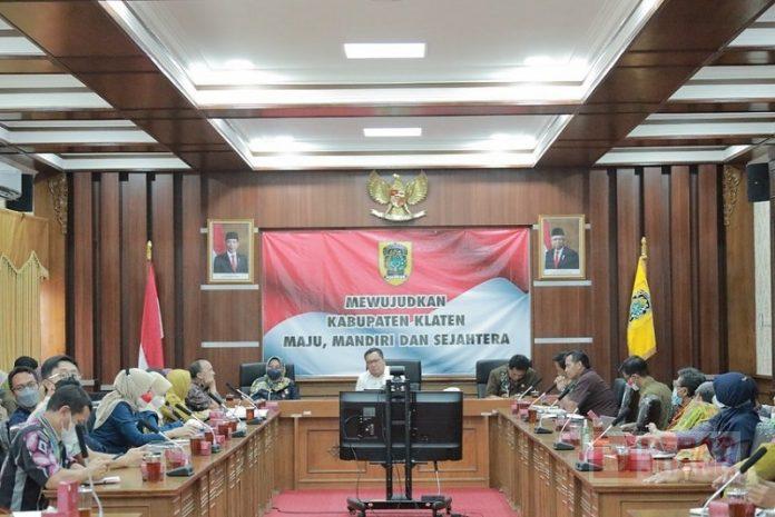 Kabupaten Klaten- Kementerian Koordinator Bidang Pembangunan Manusia dan Kebudayaan Republik Indonesia dengan Staf Khusus Presiden Bidang Ekonomi melakukan kunjungan kerja ke Kabupaten Klaten dan disambut langsung oleh Bupati Klaten, Hj. Sri Mulyani, S.M bersama Wabup Klaten, Pj Sekda, Asisten, dan Kepala OPD Kabupaten Klaten di Ruang Rapat Utama Gedung Setda Klaten, Kamis (11/8/2022).