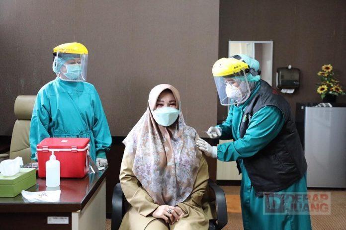 Kabupaten Klaten – Bupati Klaten Hj. Sri Mulyani melaksanakan vaksinasi tahap II yang digelar di RS Bagas Waras, Senin (08/02/2021). Vaksinasi ini diikuti oleh Forkopimda, tokoh masyarakat, dan tokoh agama Kabupaten Klaten yang sebelumnya mendapatkan vaksin pertama pada 25 Januari 2021.