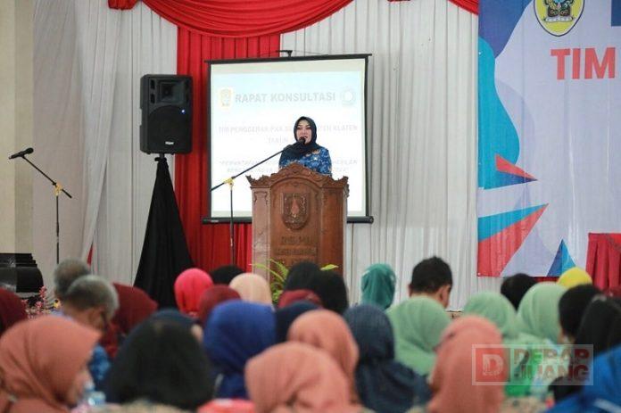 Pada kesempatan tersebut, Bupati Klaten, Hj. Sri Mulyani, S.M menyampaikan rapat konsultasi yang diselengagrakan merupakan salah satu bentuk peran serta PKK dalam membangun keluarga dan masyarakat yang dijabarkan melalui berbagai program kerja dan selanjutnya diwujudkan dalam kegiatan nyata.