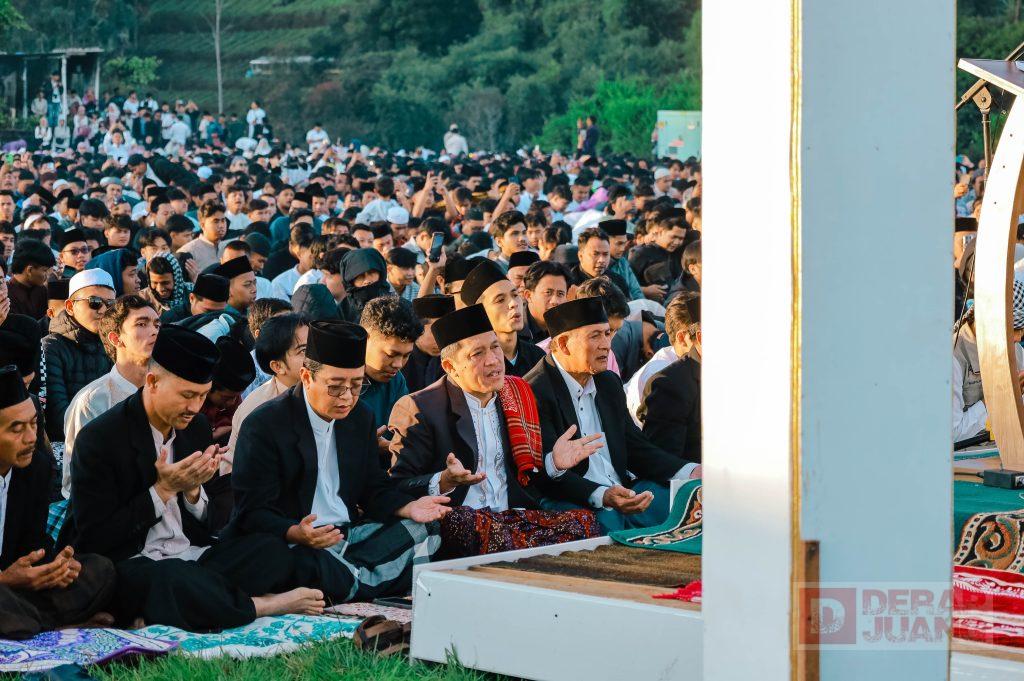 Turut hadir dalam barisan jamaah adalah Bupati Wonosobo, Afif Nurhidayat, S.Ag, yang dengan penuh khidmat mengikuti seluruh rangkaian ibadah di tengah udara sejuk dan pemandangan alam yang memesona.
