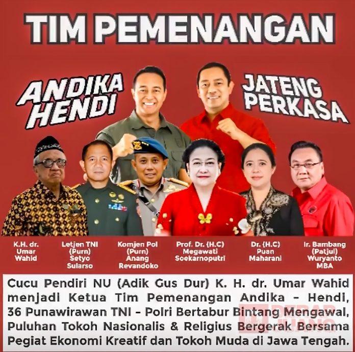 Kota Semarang – Setelah diumumkan Ketua Tim Pemenangan untuk pasangan nomor urut 1 Andika Perkasa-Hendrar Prihadi, Komisi Pemilihan Umum (KPU) Jawa Tengah (Jateng) mengumumkan daftar lengkap tim kampanye pasangan calon Gubernur-Wakil Gubernur Jateng Andika-Hendi, lewat akun Instagram @kpujateng, Rabu (2/10/2024).