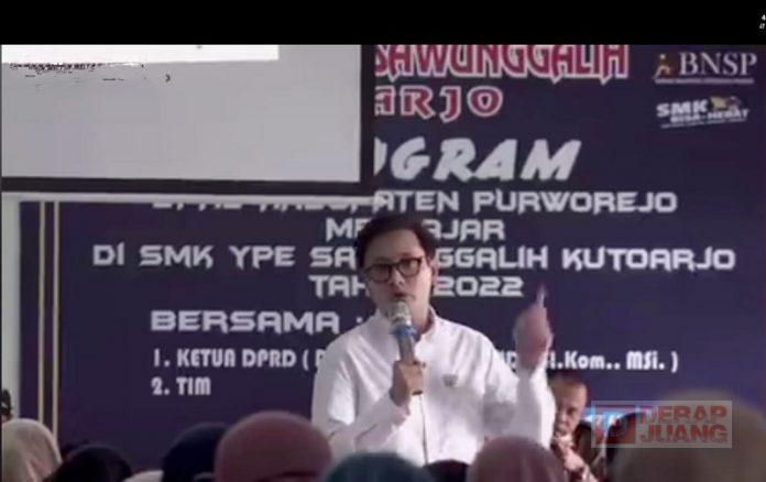 Kabupaten Purworejo – Guna memberikan pemahaman politik pada siswa-siswi SMA/SMK, Ketua DPRD Purworejo, Dion Agasi Setiabudi, S.I.Kom., M.Si melaksanakan program kegiatan DPRD Kabupaten Purworejo Mengajar di SMK YPE Sawunggalih Kutoarjo, Kecamatan Kutoarjo, Kamis (17/3/2022).