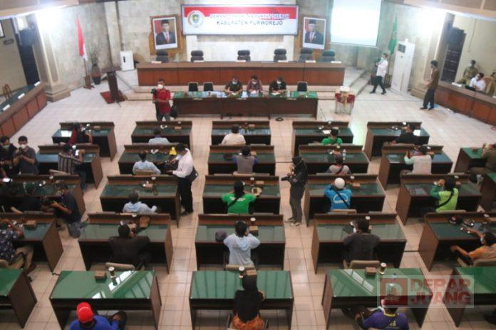 Kabupaten Purworejo – Ketua DPRD Kabupaten Purworejo, Dion Agasi Setiabudi bersama jajaran pimpinan DPRD menerima audiensi dari Aliansi Petani Purworejo Selatan di Kantor DPRD Purworejo, Senin (21/2/2022).