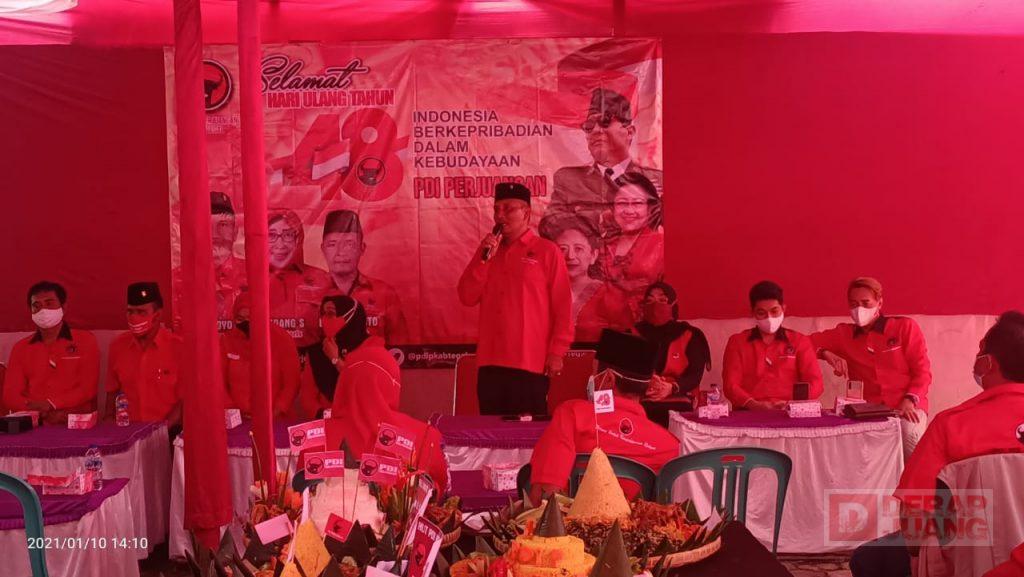 Rangkaian HUT PDI Perjuangan ke-48 kali ini berbeda dari tahun sebelumnya. Mengingat saat ini masih dalam situasi Pandemi Covid-19. Namun, sebagai Kader Partai, jajaran Pengurus PDI Perjuangan yang berada di Kab. Tegal sangat antusias dalam mendengarkan Pidato, serta arahan Ketua Umum PDI Perjuangan, Dr.(HC) Megawati Soekarnoputri, serta dari salah satu Kader terbaik PDI Perjuangan yang saat ini menjadi Presiden Republik Indonesia, Ir. Joko Widodo.