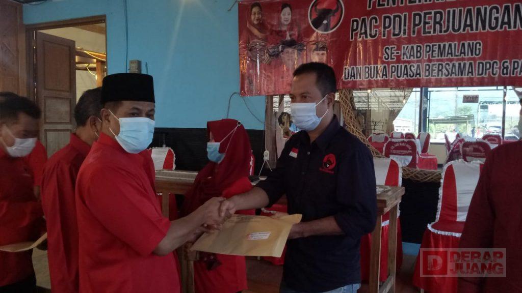 Kabupaten Pemalang – DPC PDI Perjuangan Kab. Pemalang menyerahkan Surat Keputusan (SK) DPD PDI Perjuangan Jawa Tengah tentang Kepengurusan PAC PDI Perjuangan di Kab. Pemalang, untuk Pemalang Wilayah Selatan. Kegiatan yang dilaksanakan sekaligus, dengan berbuka puasa bersama, diselenggarakan di Kafe Junna’s, Kecamatan Moga, Sabtu, (8/5/2021).