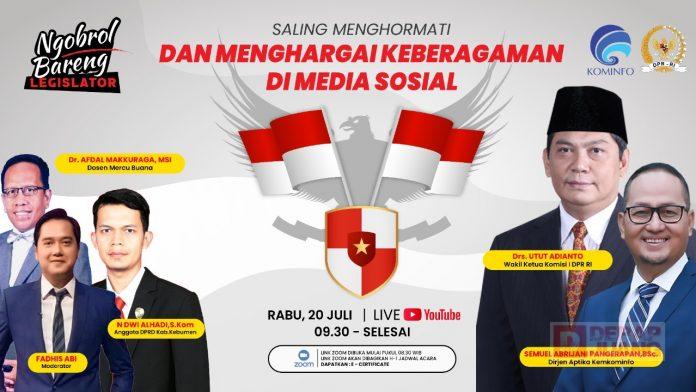 Kabupaten Kebumen – N.Dwi Alhadi, Anggota DPRD Kebumen sekaligus Ketua PAC PDI Perjuangan Kec. Kebumen menjadi salah satu narasumber kegiatan webinar berjudul ‘Ngobrol Bareng Legislator dengan Saling Menghormati dan Menghargai Keberagaman di Media Sosial.