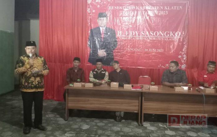 Kabupaten Klaten – Ketua Fraksi PDI Perjuangan DPRD Klaten, H. Edy Sasongko menggelar Reses Tahap II Tahun 2023 di Desa Pogung, Kecamatan Cawas, Sabtu (10/6/2023). Turut hadir dalam kegiatan reses tersebut Ranting Dan Anak Ranting PDI Perjuangan Desa Pogung, Dinas Kesehatan Klaten, Kepala Desa, Perangkat Desa, Koordinator PKH Klaten, BPD, TKSK, Kader Posyandu, RW/RT, tokoh masyarakat, tokoh agama, tokoh pemuda, dan warga masyarakat lainnya.