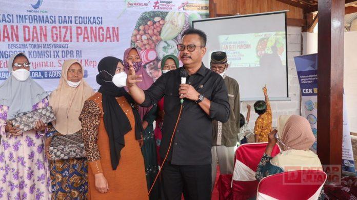Kabupaten Blora – Anggota Fraksi PDI Perjuangan DPR RI Komisi IX, Dr. H. Edy Wuryanto, S.Kp., M.Kep menggelar kegiatan Komunikasi Informasi dan Edukasi (KIE) tentang pengawasan keamanan, mutu gizi dan manfaat pangan olahan resiko tinggi. Kegiatan yang bekerjasama dengan Badan Pengawas Obat dan Makanan (BPOM) tersebut, dilaksanakan di Desa Jurangjero, Kecamatan Bogorejo, Sabtu (6/8/2022).
