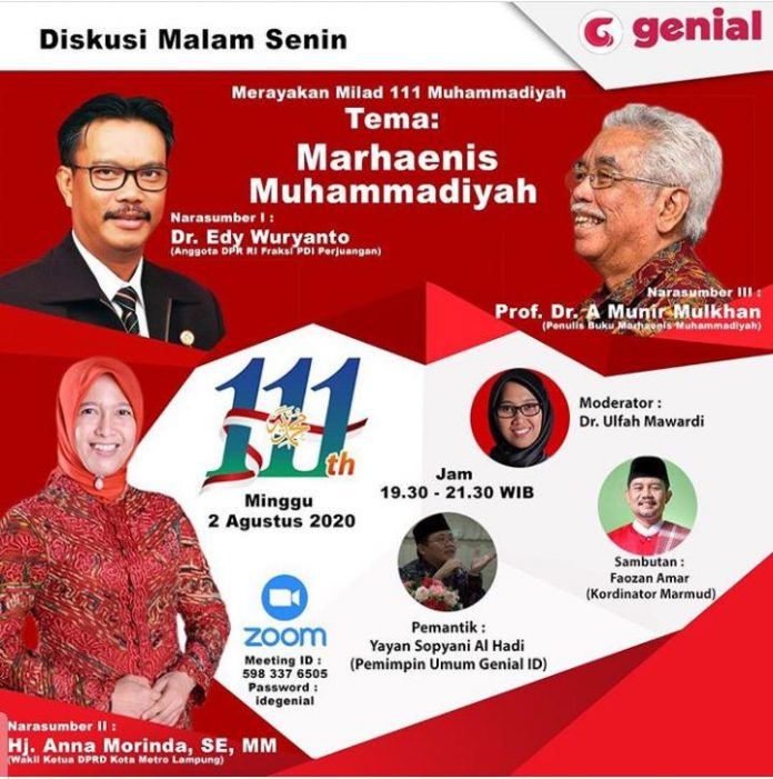Tema yang diusung pada Webinar ini adalah Marhaenisme Muhammadiyah, dengan didukung pemateri lainnya, yakni Hj. Hanna Morinda, SE., M.M., yang juga Wakil Ketua DPRD Metro Lampung serta di moderatori oleh Dr. Ulfa Mawardi.