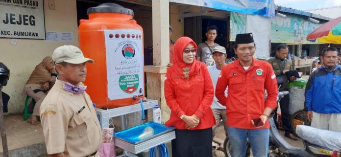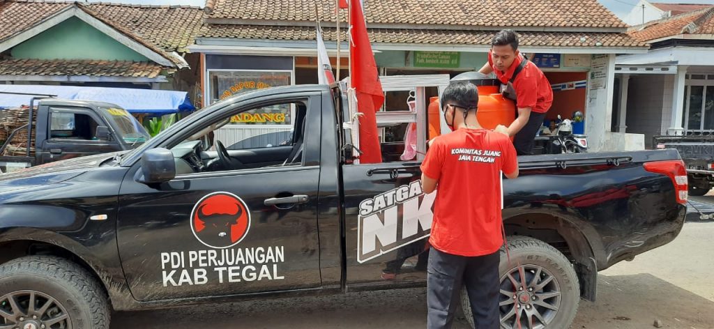 Kabupaten Tegal – Wakil Ketua DPD PDI Perjuangan Jawa Tengah, Hj. Nok Farhatun beserta pengurus DPC PDI Perjuangan Kabupaten Tegal, PC BAMUSI Kabupaten Tegal , Komunitas Juang dan sayap partai membagikan pamflet, alat cuci tangan dan masker di exit tol Adiwerna, Desa Grogol kecamatan Dukuhturi, Desa adiwerna RT. 17/07 Kecamatan Adiwerna, Pondok pesantren Al-Hasymiyah Danawarih serta pasar–pasar di Kabupaten Tegal, (13/4).