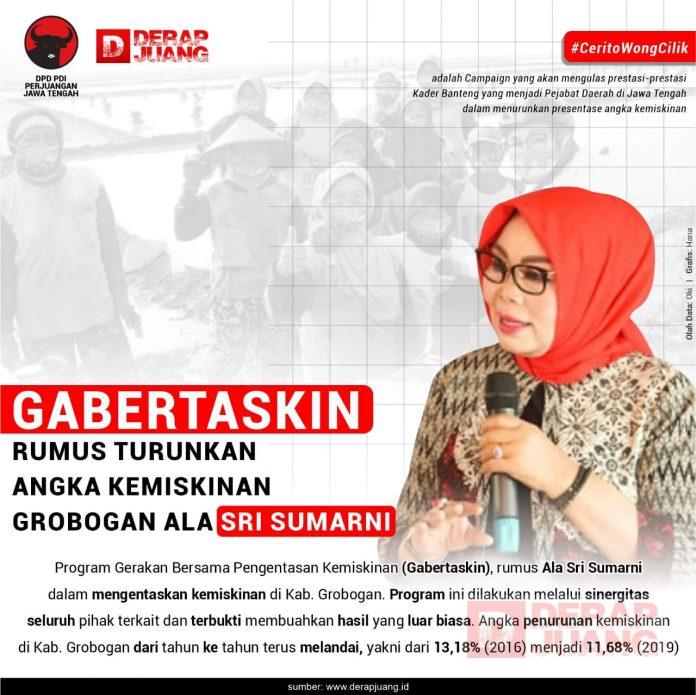 Kabupaten Grobogan – Di bawah kepemimpinan Sri Sumarni periode pertama, yaitu tahun 2016-2021, Pemerintah Kab. Grobogan telah melakukan gebrakan dengan mencanangkan Program Gerakan Bersama Pengentasan Kemiskinan atau yang dikenal dengan istilah Gabertaskin.
