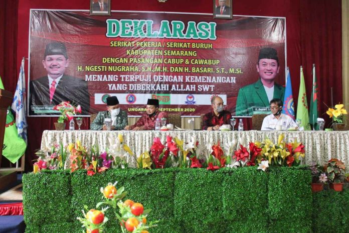 Kabupaten Semarang – Gabungan Serikat Pekerja dan Serikat Buruh KSPN, FARKES, KAHUD, serta KSPSI di Kab. Semarang mendeklarasikan dukungan Pasangan Calon Bupati dan Wakil Bupati Kab. Semarang, Ngesti Nugraha, S.H., M.H., dan Basari, S.T., M.Si., (Ngebas) untuk kontestasi Pilkada 2020 yang akan diselenggarakan pada 9 Desember 2020 mendatang. Acara tersebut dilaksanakan di Rumah Makan Cikal Gading Kecamatan Tuntang, Sabtu (19/9/2020).