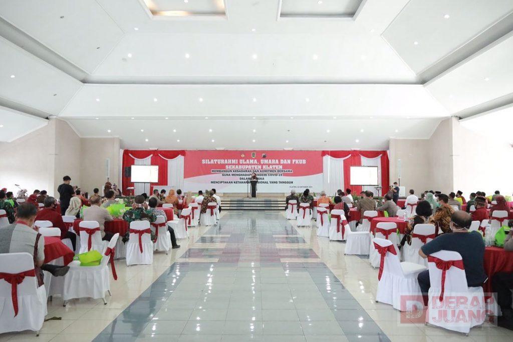 Kabupaten Klaten – Bupati Klaten, Hj. Sri Mulyani menghadiri silaturahmi Ulama, Umara dan FKUB se-Kab. Klaten, di Gedung Pandanaran Klaten. Turut hadir dalam kegiatan tersebut, antara lain, Kapolres Klaten, Eko Prasetyo, serta Dandim 0723 Klaten, Joni Eko Prasetyo, Jumat (22/10/2021).