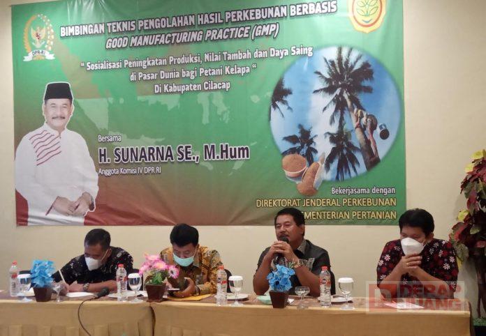Kabupaten Cilacap – Anggota DPR RI Komisi IV Fraksi PDI Perjuangan, H. Sunarna, S.E,. M.Hum bersama dengan Kementerian Pertanian Republik Indonesia menggelar Bimbingan Teknis (Bimtek) Pengolahan Hasil Perkebunan Berbasis “Good Manufacturing Practice (GMP)” dan Sosialisasi Peningkatan Produksi, Nilai Tambah, dan Daya Saing di Pasar Dunia Bagi Petani Kelapa di Kab. Cilacap.