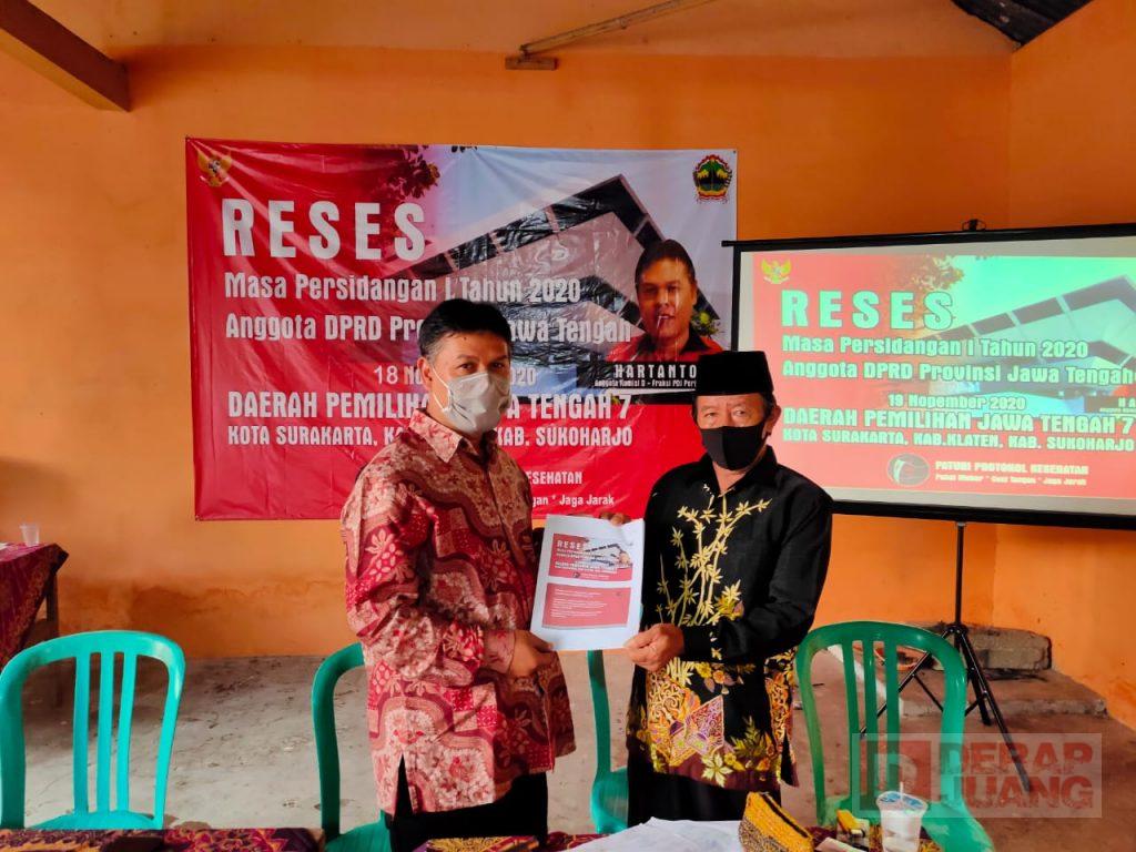 Kabupaten Klaten – Anggota Fraksi PDI Perjuangan Provinsi Jawa Tengah, Hartanto menyelenggarakan kegiatan Reses di Kab. Klaten. Kegiatan tersebut dilaksanakan di Daerah Pemilihan (Dapil) VII yang terdiri dari 5 Kecamatan, yaitu Kecamatan Kemalang, Kecamatan Jatinom, Kecamatan Kebonarum, Kecamatan Karangnongko, serta Kecamatan Manisrenggo, Rabu-Sabtu, (18-21/11/2020).
