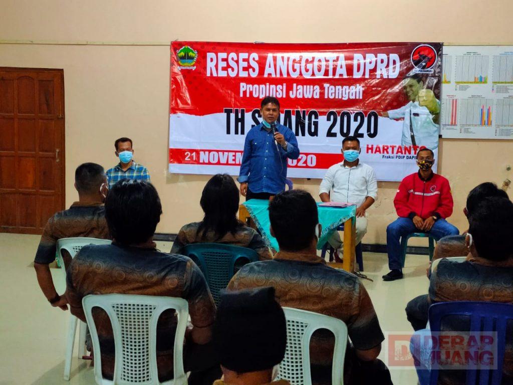 Anggota Fraksi PDI Perjuangan Provinsi Jawa Tengah, Hartanto mengatakan. dalam kegiatan Reses kali ini, sedikit berbeda dari kegiatan pada reses sebelumnya. Pada kegiatan reses sebelumnya, dapat dihadiri sekitar 100 sampai dengan 200 masyarakat. Namun, kali ini hanya dihadiri tidak lebih dari 50 orang. Hal tersebut sesuai dengan Protokol Kesehatan dalam mengantisipasi penyebaran virus Covid-19.