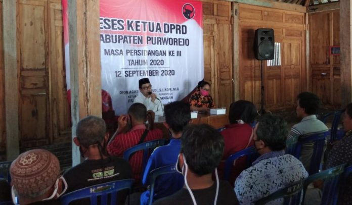 Kabupaten Purworejo – Ketua DPRD Kab. Purworejo, Dion Agasi Setiabudi, Si.Com, M.Si. menyerap aspirasi msyarakat dengan mengadakan kegiatan reses. Dihadiri oleh perwakilan pelaku seni se-Kab. Purworejo, serta Kader Komunitas Juang Kab. Purworejo, Reses dilaksanakan di Kecamatan Purworejo dengan mematuhi protokol kesehatan yang sudah ditetapkan Pemerintah, Jumat (11/9/2020).