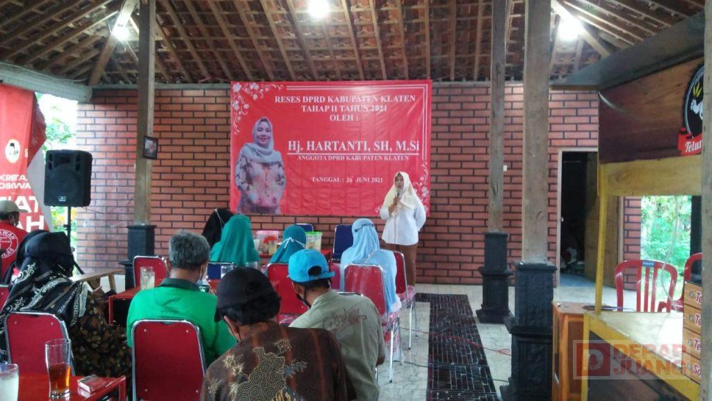 Kabupaten Klaten – Anggota Fraksi PDI Perjuangan DPRD Kab. Klaten, Hj. Hartanti, S.H., M.Si menggelar serap aspirasi masyarakat dalam rangka Reses tahap II Tahun 2021. Reses yang dilaksanakan di Joglo Omah Sambung, Desa Ploso Wangi, Kecamatan Cawas, hanya dihadiri oleh 50 orang, Kamis-Sabtu, (24-26/6/2021).